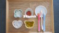 離乳食プレートを作ったため、その時に使った食材の余りを使用。午前中は撮影したりでバタバタだったため、夕方に離乳食タイム。ハーフバースデーのお祝いについては、また別途紹介します♩